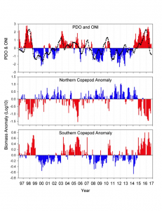 Read MoreEl Niño-Southern Oscillation (ENSO) events activate long-distance teleconnections through the atmosphere and ocean that can dramatically impact marine ecosystems along the West Coast of North America, affecting diverse organisms ranging from plankton to exploitable and protected species. Such ENSO-related changes to marine ecosystems can ultimately affect humans in many ways, including via depressed plankton and […]