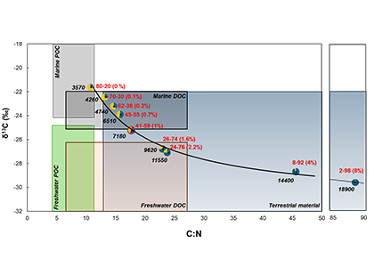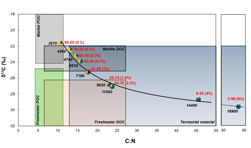 Figure: Relationship between δ¹³C, C:N, and radiocarbon (¹⁴C) age for sedimentary organic matter – polyethylene sediment admixtures. Colored boxes denote typical δ¹³C ranges of major carbon reservoirs (POC, DOC, terrestrial). Pie charts show measured positions of polyethylene admixtures (percent polyethylene by mass in parentheses), with yellow and blue sectors representing apparent marine and terrestrial contributions inferred from a two-endmember mixing model. Even 1% polyethylene contamination (red outline) substantially shifts apparent source attribution and radiocarbon age (red values). The black curve shows the modeled δ¹³C–C:N relationship